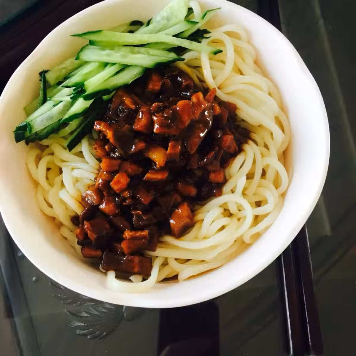 9 撈一碗麵條,放上一些黃瓜絲、胡蘿蔔絲,再舀一勺醬,就可以上桌開動了。