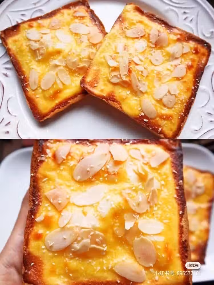 吐司片4片、 奶油奶酪50克、 芝士片2片、 細砂糖15克 、雞蛋一個、 杏仁片適量、 蔓越莓椰蓉(可不加)
