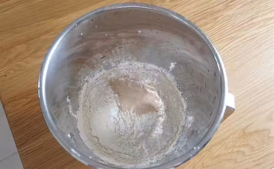 「2」低速混合至無乾粉,出厚膜時加入軟化好的黃油和鹽;