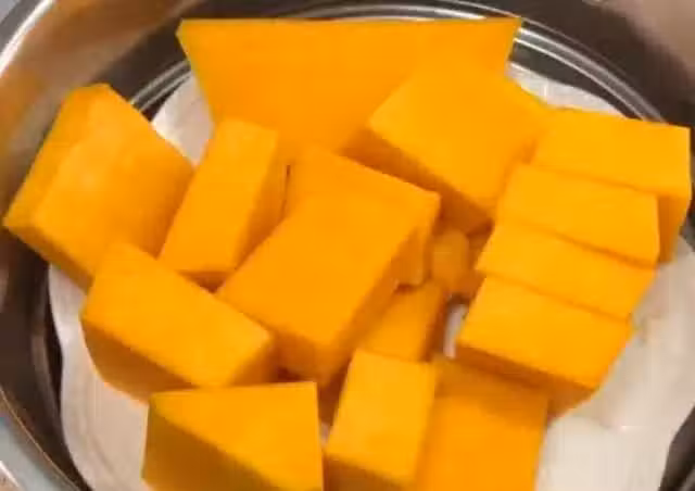 3,蒸好的南瓜直接倒入料理機中,打成細膩的泥倒入大碗中,