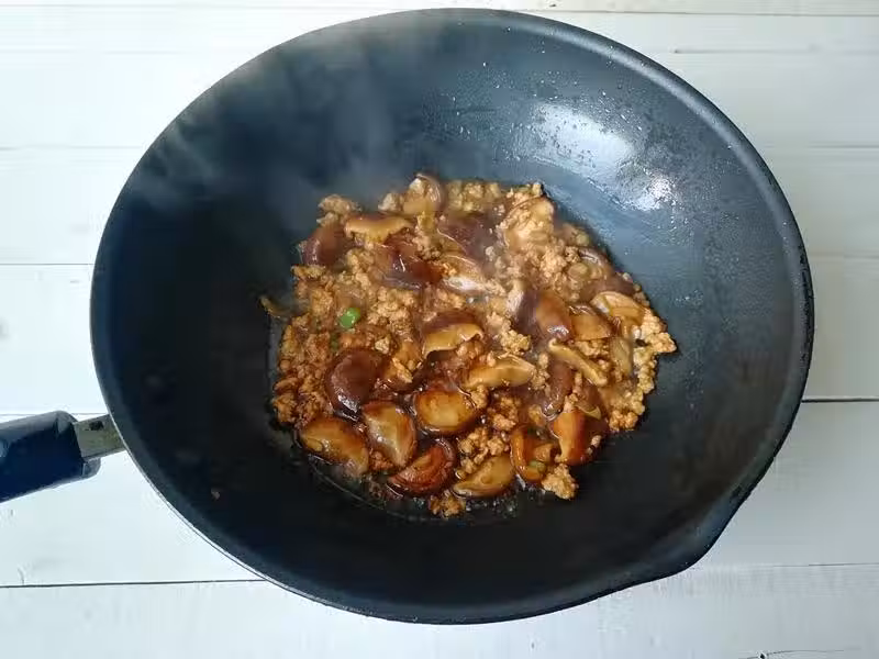 5.下入香菇翻炒均勻,在加入料酒、鹽、醬油、在加入少許水將香菇燒制入味5分鐘