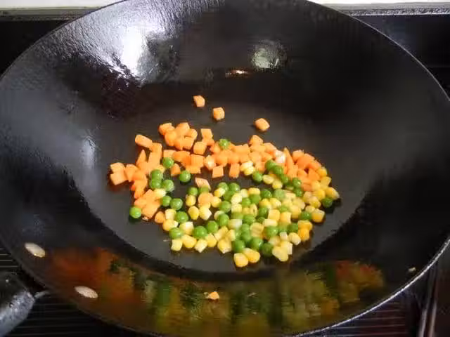 4.鍋里油熱,放入胡蘿蔔,豌豆,玉米粒,加2調羹水,煸炒至發蔫,盛出.