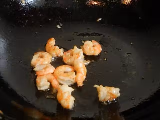 5.鍋里油熱,放下蝦仁煸炒至轉色,加料酒煸幾下,盛出.
