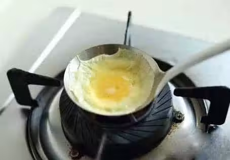 取肉餡放入蛋餃皮一側,將另一側對摺過來,繼續小火加熱,並用小勺壓一壓封口,直到封牢即可取出