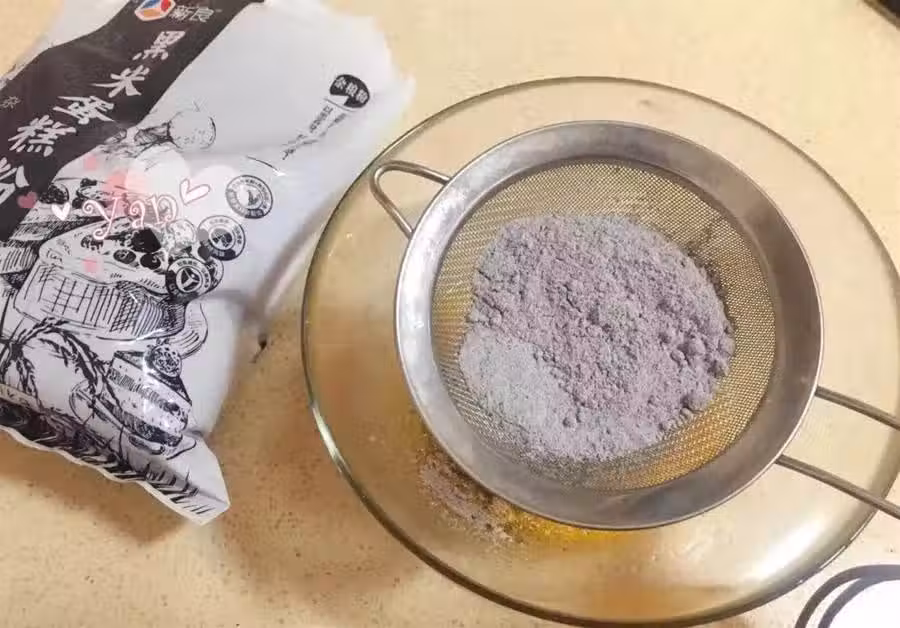 篩入黑米粉,用刮刀翻拌均勻(黑米粉一定要過篩)
