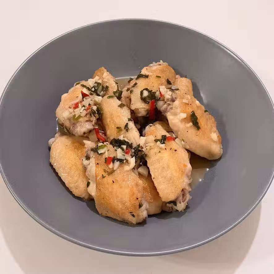2 煎雞翅時,可開始蒜頭切末、辣雞切小段、香菜切斷,備用