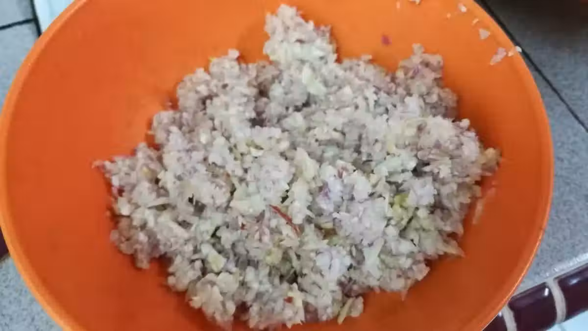 3)把攪爛好的泥和腌制調味料加進雞塊里,拌均。腌制至少3個小時或至過夜。