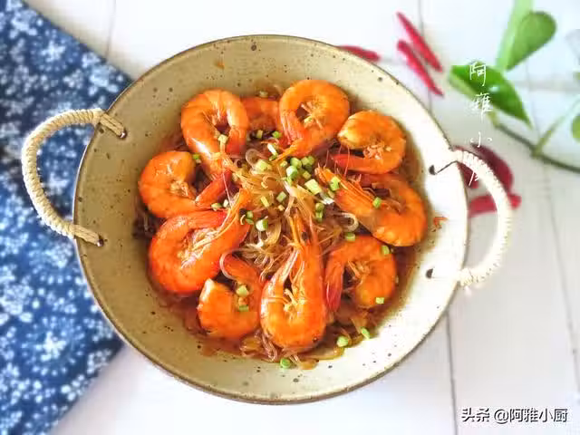 製作步驟:粉絲提前用溫水泡軟,大蝦開背後剔除蝦線;鍋中熱油,加入蔥花和薑片爆香,加入大蝦翻炒出紅油,加入一點生抽提鮮;加上泡軟的粉絲,再加入沒過粉絲的清水,蓋上蓋子小火悶至水分收干,主要是讓粉絲煮軟爛煮入味;水分收的差不多了就可以出鍋啦。