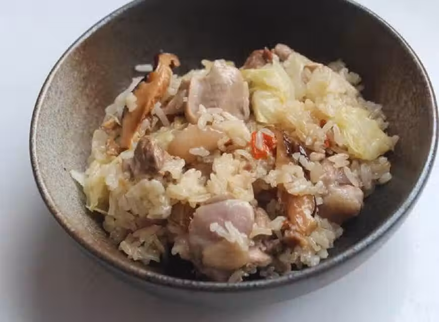 去骨雞腿肉:2隻、長糯米:2.5量米杯(180CC/杯)、白米:0.5米杯、薑薄片:20片、紅蔥頭:4-5瓣、幹香菇:2大朵,泡水後切絲、高麗菜:300g、當歸:1小片、枸杞:十幾粒、香菇水:1.5量米杯、米酒:1量米杯、醬油:1-2大匙、鹽:適量、胡椒:適量、白麻油:2大匙、黑麻油:4大匙