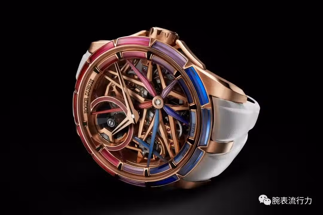 桀驁不羈,是羅傑杜彼Roger Dubuis與生俱來的基因; 持續創新,是羅傑杜彼Roger Dubuis恆久不變的追求。 天生出眾,無懼閃耀。作為創新者,羅傑杜彼憑藉桀驁表現力與精湛工藝不斷開拓制表新境界,使全新王者系列霓虹Spin-Stone™[1]腕錶綻放絢麗螢光的無窮潛力。霓虹系列憑藉精湛的發光美學與卓越的性能名聲大噪。隨著最新系列的腕錶成為焦點,卓絕前衛的王者系列霓虹Spin-Stone™腕錶又向前邁出了大膽的一步。此款獨具匠心的腕錶將品牌的制表工藝推向極致,每個細節都熠熠生輝。全新時計搭載 RD720SQ 機芯,閃耀藝術美感,一登場即吸引全場目光。 [1] 環繞著表圈與盤緣的耀眼非凡的尖晶石,呈現由紅色漸變至藍色的螢光彩虹色調,帶有旋轉效果, 每一枚尖晶石都是獨具匠心的作品,均以其標誌性的曲線與犀利的角度進行巧妙雕刻,此項全球首創的寶石切割技術正在申請專利。