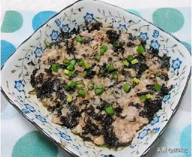 7、用剪刀剪成小小塊紫菜,把紫菜加入肉沫中拌均勻。