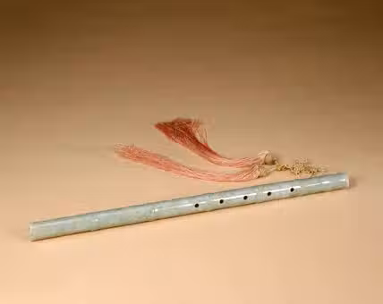 翠質青綠。 簫為 竹節狀,中空,側面有音孔,一端有吹孔,佩黃絛和紅穗。