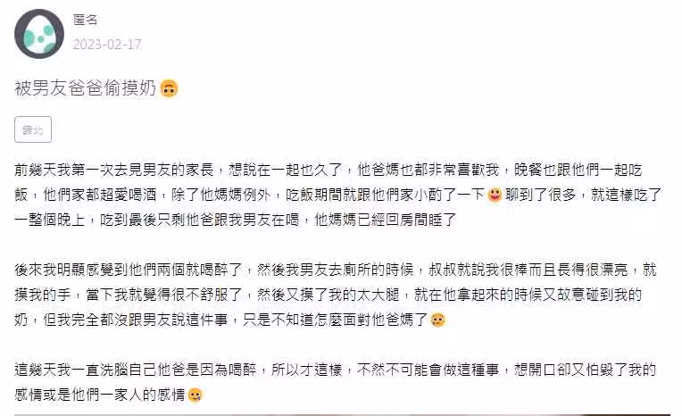 貼文曝光後,網友紛紛留言「你不開口,對方會變本加厲,以後都拿酒醉當藉口觸碰你身體。你是女孩子,應懂這些吧,當你想著怕破壞別人情感,你想過自己正在被性騷擾嗎,還摸上了。先為自己發聲再去為別人想吧」、「我覺得一次就當做意外 或許是真的不小心,看還有沒有第二次 如果有第二次的話在跟家人說。」