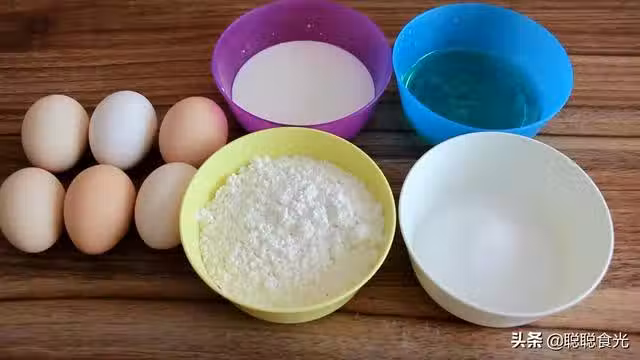 步驟二:提前稱量好電飯鍋蛋糕要用的食材,雞蛋6個,牛奶80克,玉米油60克,低筋粉100克,砂糖80克,我用的電飯鍋內膽直徑19厘米,用了6個雞蛋,具體比例可以根據鍋的直徑換算。