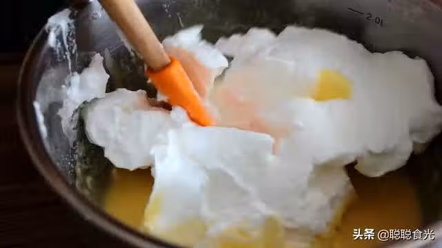 步驟八:取三分之一的蛋清與蛋黃糊混合,用翻拌手法混合均勻,邊翻拌邊轉動打蛋盆,直到混合成這種沒有蛋白顆粒的狀態就可以了,然後再取三分之一蛋清,用同樣方法翻拌均勻,翻拌均勻後加入最後的蛋清,也是同樣手法拌勻。