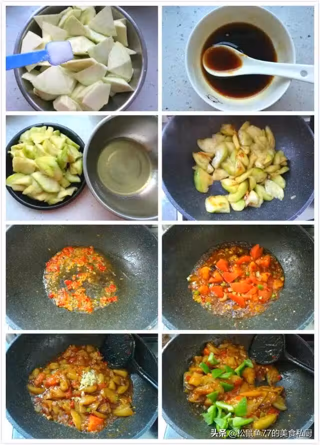 炒鍋燒熱,倒入適量的食用油,下茄子炒軟,盛出來裝盤待用。把鍋刷洗乾淨,放一點點油,加入1勺剁辣椒,轉小火,炒出香味。加入蔥花、薑末,再加入一半的蒜末炒出香味。把西紅柿塊放進鍋里,翻炒出湯汁。把調好的料汁倒進去,翻炒均勻,然後把茄子放進鍋里,加入1勺鹽,加入剩下的另一半蒜末,炒香。翻炒均勻,出鍋前,加入青椒塊,炒勻。