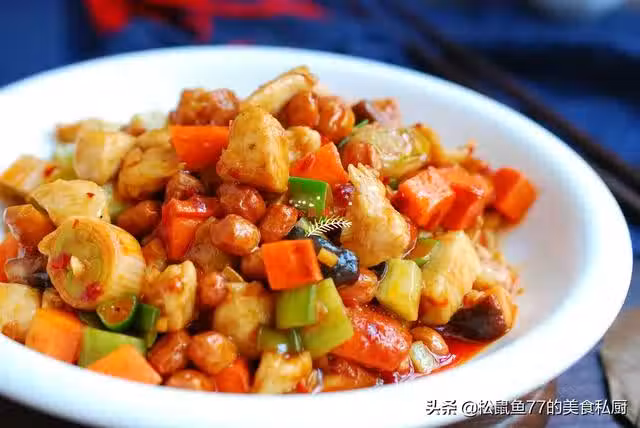 食材:雞胸肉300克,花生米100克,胡蘿蔔1根,黃瓜1根,香菇3朵,大蔥1根,老薑1塊,鹽適量,郫縣豆瓣醬1勺,米醋1勺,白糖2勺,胡椒粉1小勺,料酒1勺,玉米澱粉1勺,食用油適量