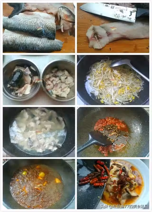 製作:草魚開膛去內臟、去腮,清理乾淨,剁掉魚頭,順著魚的脊骨取下兩片魚肉。魚肉片成片,魚肉厚的地方直接片成一片,魚肉薄的地方可以片成蝴蝶片,魚骨剁成塊,魚頭剁開,魚肉和魚骨分別放在兩個盆子裡,加入生抽、老抽、蚝油、胡椒粉、辣椒粉、玉米澱粉,混合攪拌均勻,腌制30分鐘以上。鍋里加入適量清水燒開,黃豆芽清洗乾淨下鍋焯熟,撈出來放在一會兒要裝魚的盤子裡,墊底鋪勻,最好是深一些大一點的盤子。接著把魚骨焯燙熟,撈出來放在黃豆芽上,再把魚片燙熟,魚片容易爛,一定要最小火,魚片要展開,一片一片地放下去,保持魚片不粘連,最小火慢慢養熟,魚片變色即可撈出,裝進盤子。炒鍋燒熱放入適量食用油,油熱後下入1勺郫縣豆瓣醬炒出紅油,再加入1小把麻椒炒香,下入蔥段、薑片煸炒出香味,加入適量清水,燒開後倒入魚片中。炒鍋刷洗乾淨重新加熱燒乾倒油,中小火加熱,下入干辣椒段慢慢炸香,趁熱澆在魚片上即可。