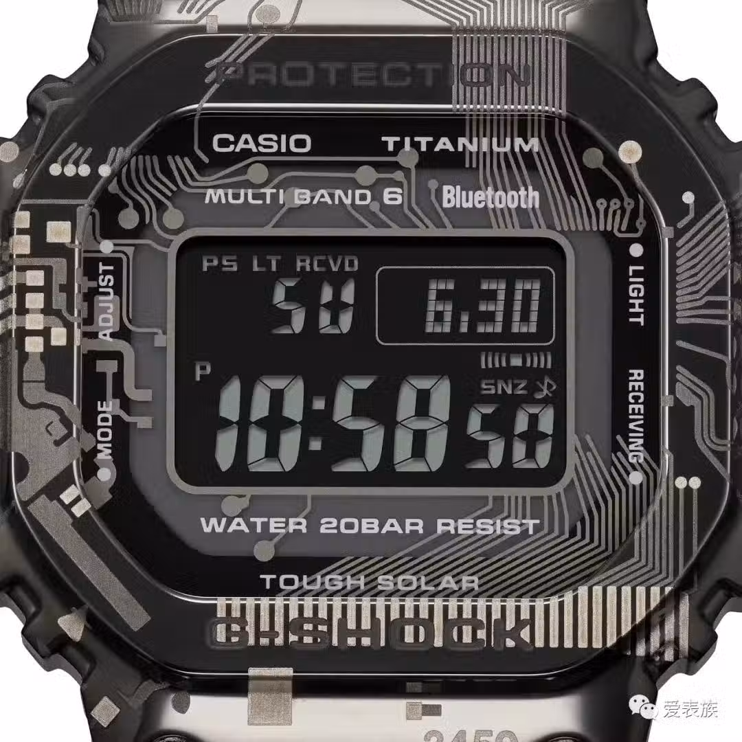 G -Shock GMW-B5000TCC-1具有類似於DWE-5600CC-3的電路板設計。這種類似迷彩的圖案是表圈和錶帶上的黑色離子電鍍以及產生兩種色調的兩道工序雷射鵰刻的結果。模塊編號「3459」刻在下表圈上,電路圖案延伸到手錶的表面和太陽能電池板上。