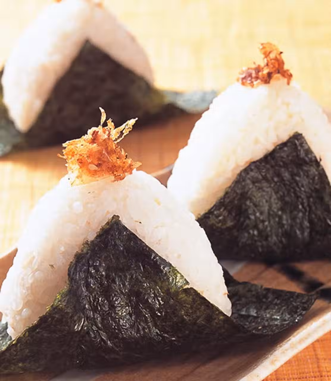 3 在作法1的白米飯中放入芝麻柴魚,並再用手捏製整型成三角形飯糰後
