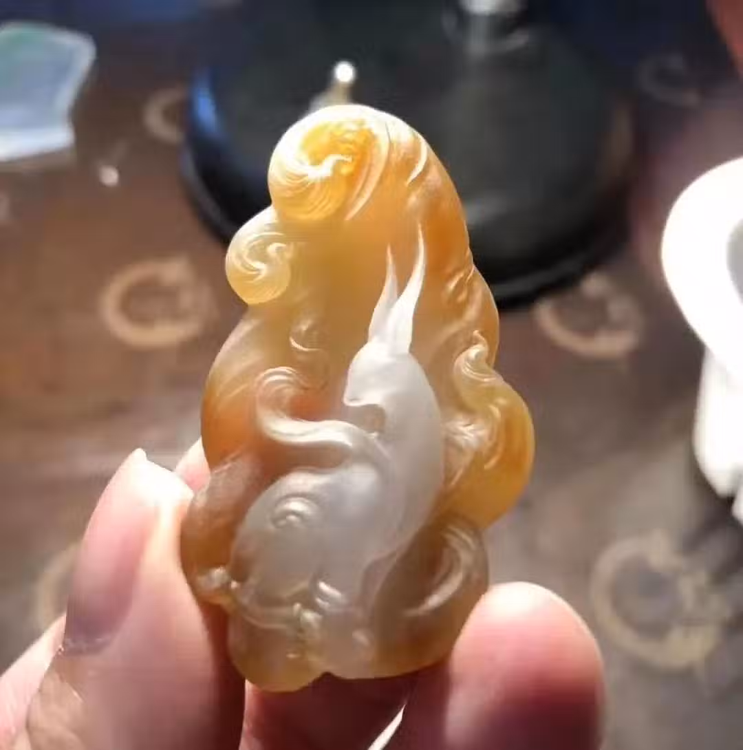 白肉的部分雕刻了狐狸的主題,整體立體的凸現了出來,肉眼可見冰種的既視感,後面黃翡的部分設計成狐狸的九條尾巴,將狐狸的部分完全承託了出來,立體感極強,最後看看拋光後成品的效果。