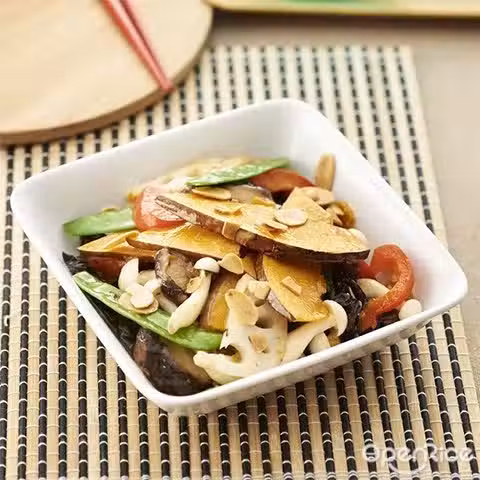Ingredients A | 材料A:100g pumpkin slices | 金瓜片100克 Ingredients B | 材料B:60g lotus root (slices) | 蓮藕片60克, 50g red capsicum |紅甜椒50克, 30g white mushroom | 白玉菇30克, 15g saoked baby fungus| 已浸發雲耳15克, 25g snow peas | 荷蘭豆25克