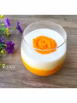 4. 倒入杯中,上部倒入適量酸奶,放上芒果花做裝飾。