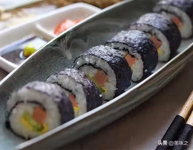 5、利刀沾涼開水快速切開,擺放盤中,魚子醬、青芥辣和淡口醬油作為蘸料,也可以把沙拉醬直接擠在紫菜卷上食用;
