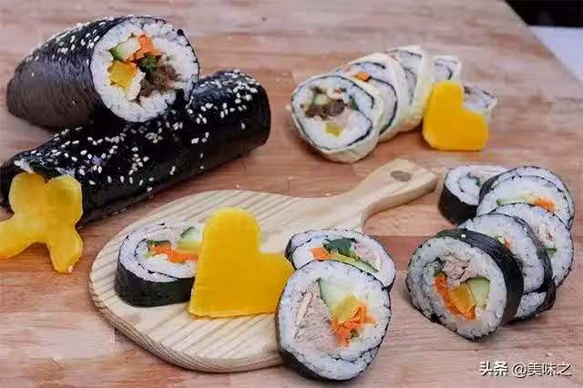 15、別忘了切之前用濕抹布搽一下刀刃以免米粒粘在上面不好切,而且每切幾塊以後時不時再查搽一下。這樣美味的3種紫菜包飯完成拉。