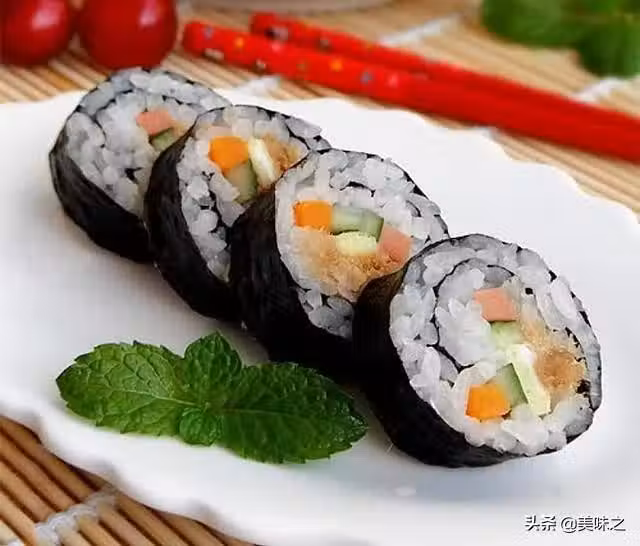 6、把切條的蔬菜放上去,用壽司簾卷卷好,最後切片就可以了。
