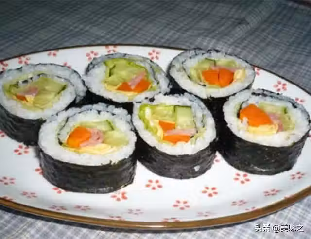 紫菜3片、大米200G、黃瓜1根、胡蘿蔔1根、生菜1個、雞蛋1個、火腿2片、米醋30ML、白糖10G。