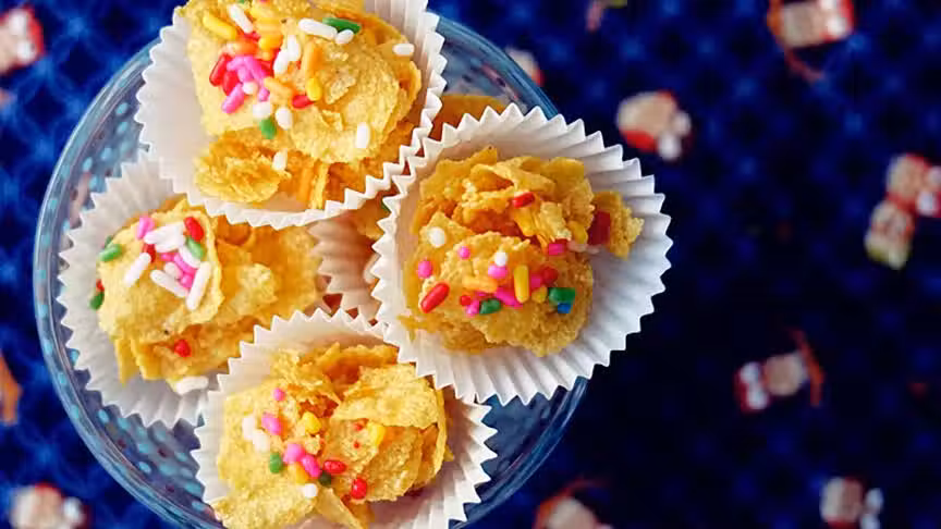 2. 玉米片拌勻,盛入小紙杯內,撒上七彩糖。