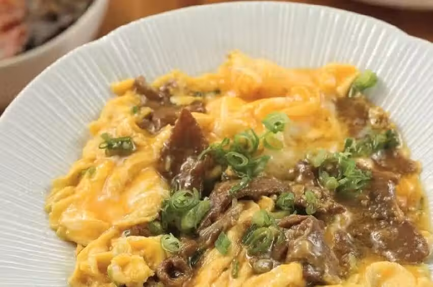 把 牛 肉 蛋 倒 入 油 中 滑 炒 至 蛋 凝 結 即 可。