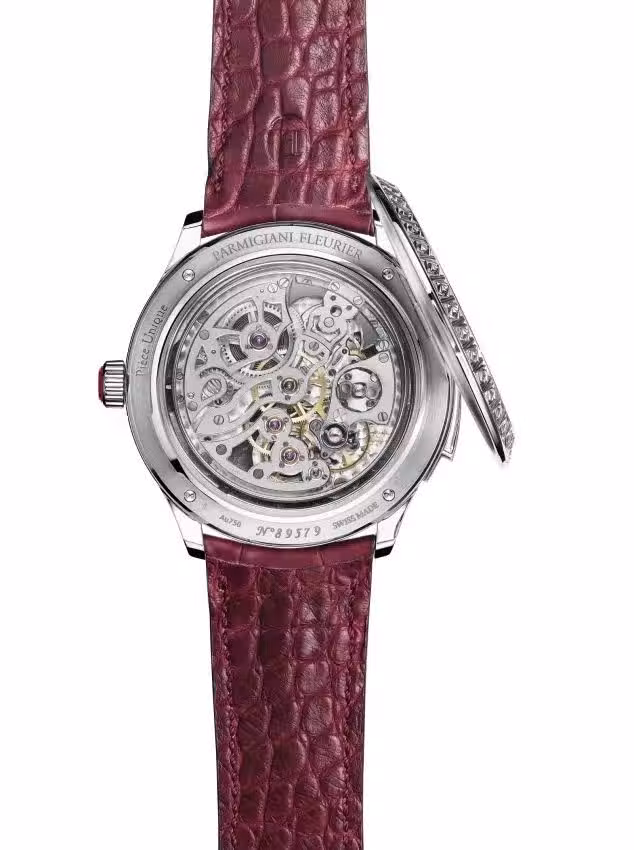 表背鐫刻序列號、「Parmigiani Fleurier」、「Swiss Made」以及「Pièce Unique」(唯一臻作)字樣