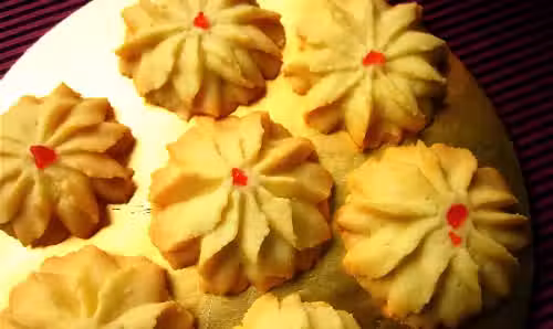 4 放入擠花袋擠出花形。預熱烤箱,180度烤10-15分鐘至金黃色