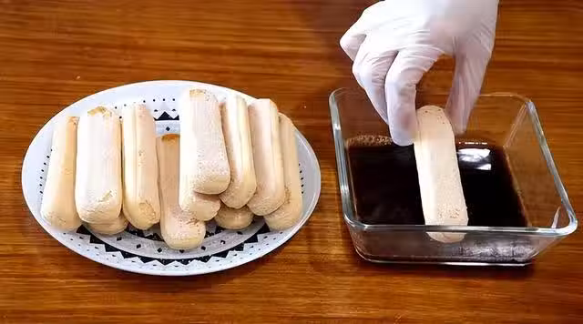 10、 繼續將滾過朗姆酒的餅乾放在奶糊糊上面,再倒上一層奶糊糊;
