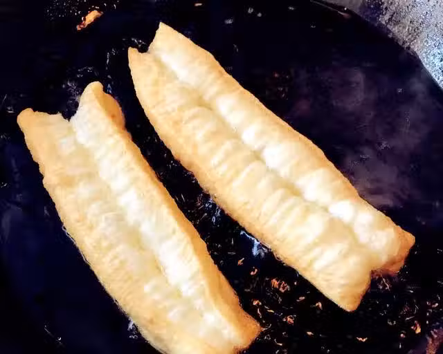 油條胚放入能馬上浮起來,馬上用筷子輔助讓油條直溜溜的,建議每次只炸兩根油條啊,因為炸制過程中要用筷子不斷翻動油條,使油條充分膨脹。炸多了實在是顧不過來,慌亂的很。