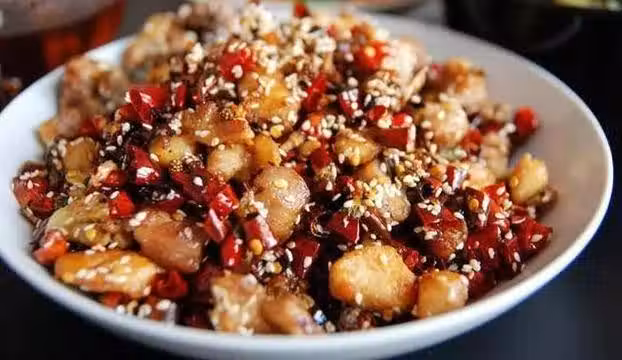 雞腿肉2隻;鹽1/2勺;醬油1/2勺;糖2勺;幹辣椒若干;花椒一小把;八角1個;蔥;食用油;熟芝麻可省去