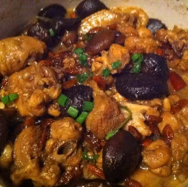 雞腿4隻;幹香菇一把;幹辣椒少許;花椒少許;蔥薑蒜少許;老抽一小勺;生抽兩勺;鹽適量;白糖適量;雞精少許;黃酒一小勺