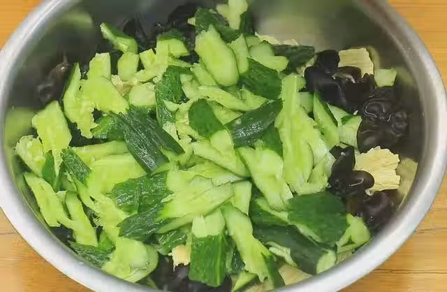 3、接著把木耳和腐竹焯一下水,鍋內燒水,水燒開後,先倒入木耳,焯水2分鐘,再倒入腐竹,30秒以後,倒出用清水沖洗,然後放入盆中。黃瓜幾根,用力的拍碎,然後斜切成段,和木耳腐竹放在一起。