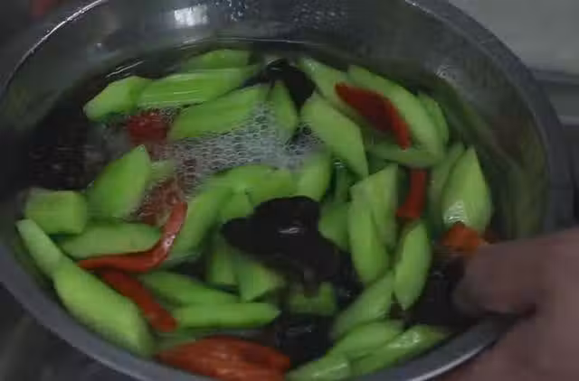 3、燒半鍋開水,倒入黃瓜、紅椒和木耳稍微燙一下,黃瓜返青以後撈出來,立即用涼水沖涼,這樣吃起來更脆。
