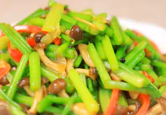 1.準備一把新鮮的蟹味菇去除根部,放入清水中多抓洗兩遍,把上面的雜質和灰塵洗乾淨,芹菜用的是小香芹,沒有老筋吃著更加清爽,把比較大的芹菜從中間劃開,切成段洗乾淨備用。
