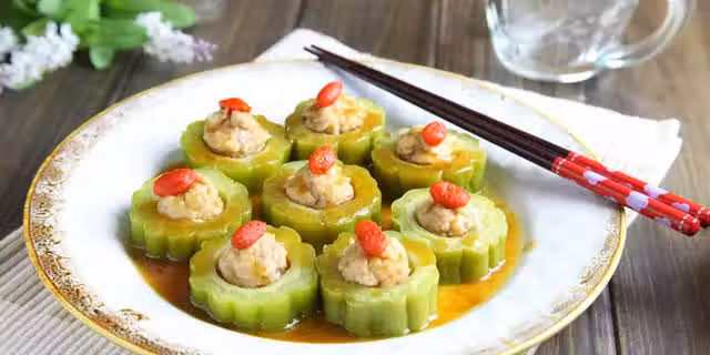 2、將苦瓜墩空心填滿肉餡,擺入盤內,入籠急火蒸熟,取出備用。