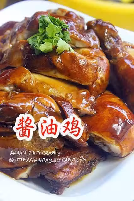 3)鍋頭熱油,爆香醃制雞的蒜頭、八角、桂皮、雞,起鍋片刻,倒入(材料B)的醬青和清水,蓋上鍋蓋,小火燜煮45分鐘至收汁。提出醬油雞斬塊排碟。