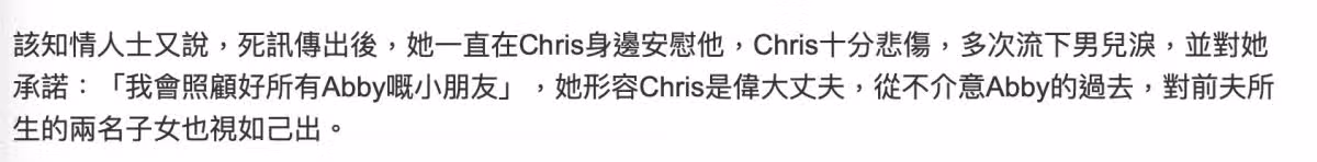 蔡天鳳對四個同母異父的子女能夠那麼融洽地相處,也倍感欣慰,所以她也偶爾帶著子女出席公開活動,比如2020年,郭富城的電影《麥路人》上映,而與郭富城妻子方媛是好友的蔡天鳳就帶著四個子女去捧場。基於此,Chris也深知四個孩子感情很好,他也不忍心妻子與前夫所生的孩子從此無依無靠,願意放下痛與恨去照顧他們。