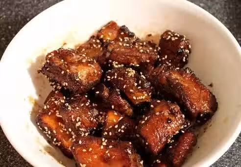 7.收汁過程中加入少許冰糖,汁收幹後沿鍋邊再倒入少許醋。