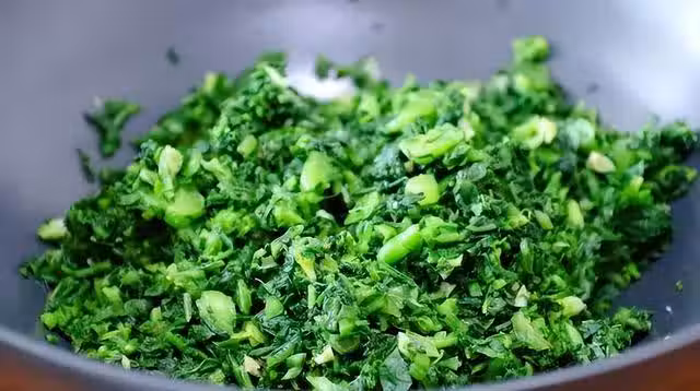 3:將芹菜和青菜末放入肉餡中攪拌均勻;