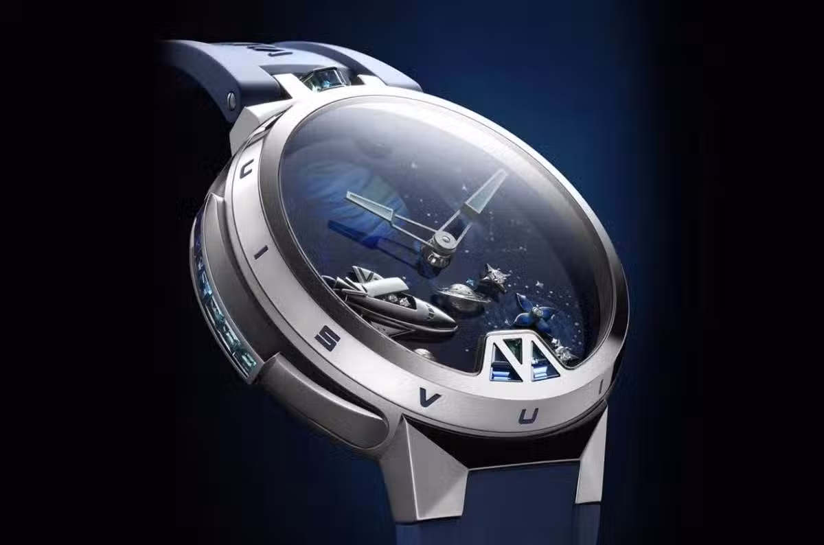 Tambour Jacquemart三問報時錶配置藍色橡膠錶帶,上下方錶帶額外帶有LOUIS加上VUITTON字樣,立體設計以及濃郁的深藍色調,再度強調手錶DNA之餘,也先一部勾勒出手錶的太空主題。錶款與一般手錶有個不同之處在於其將錶冠設置在12點方向,結合手錶的大錶徑讓人自然而人想起早期的懷錶作品,不過手錶如今可以繫於腕上的佩戴方式,就本質上早已於懷錶呈現鮮明差異。