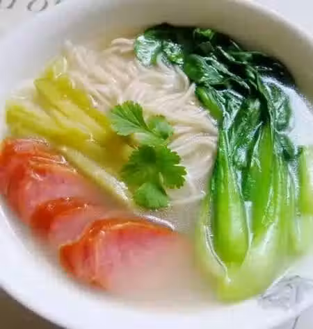 食材:麵條150g、骨湯適量、油菜適量、榨菜適量、香腸適量、紫林醋適量