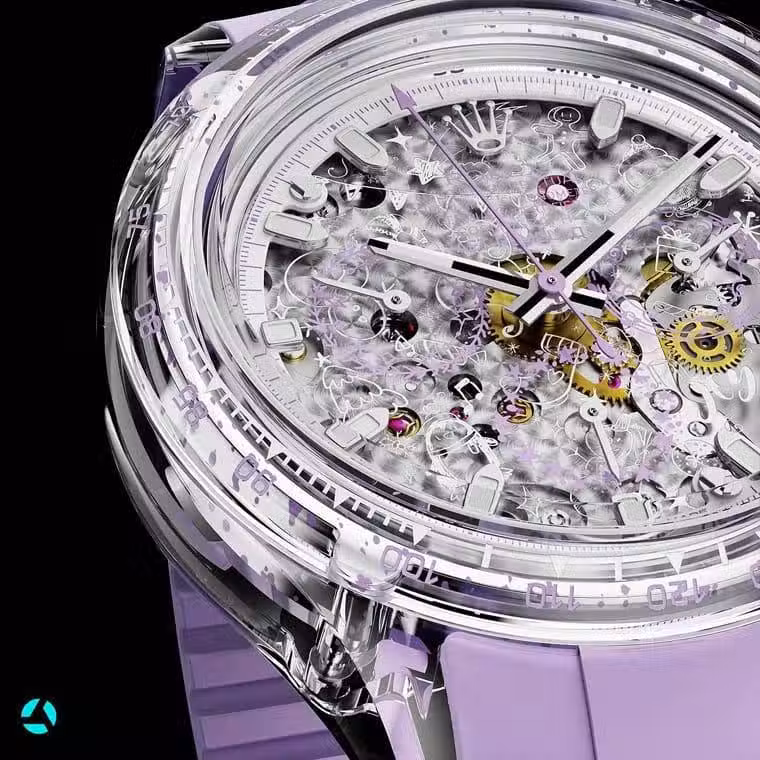這樣的答案最終決定了勞力士Daytona 「Joy's Christmas」特別版的樣貌。手錶採用藍寶石水晶材質製作錶殼,搭配淺紫色的橡膠錶帶,同時手錶錶圈刻度的數字也填上夢幻的紫色,展現和原廠設計完全不同的創意。除此之外,AET REMOULD也重新擘畫了手錶的三眼計時盤,將小錶盤用紫色勾勒出聖誕花圈般的造型,另外面盤上還可見到許多源自Joy聖誕畫中的元素,而改裝錶品牌也貼心在面盤上加上Joy的名字,然後包括勞力士字樣、手錶系列名稱等也都改用手寫體文字呈現,順間讓這款錶多了許多純真的童心。